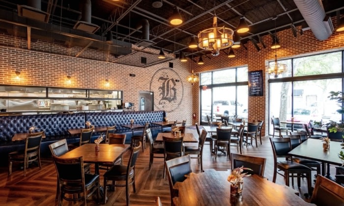 Abel Design Group expertly crafted Bosscat Kitchen & Libations in The Woodlands, blending sophisticated industrial elements with inviting comfort to create a vibrant dining atmosphere and scenic outdoor experience.