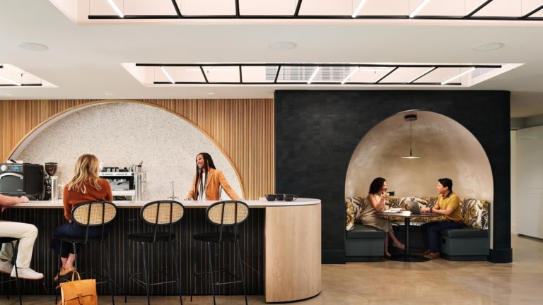 THREE at One South Amenity Space View Project Gensler James John Jetel Skan by Vibia Linear Pendant, Lobby / Common Area, Order Counter, Pendant