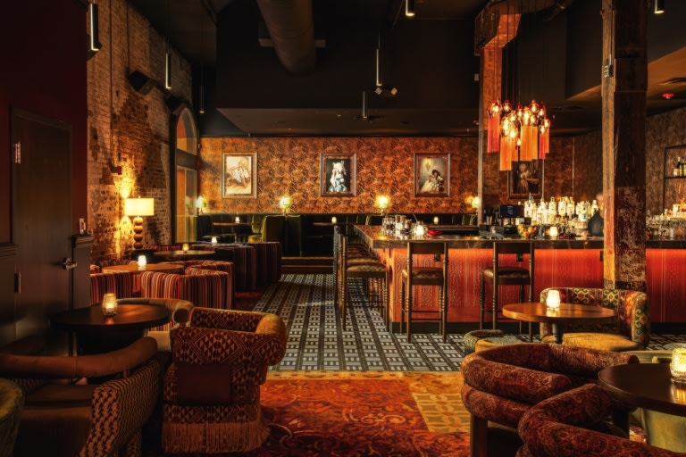 Jolie Restaurant and Lounge View Project 75 Degree Design Studio Bar, Chandelier, Cove Lighting, Dining Area, Floor Lamp, Suspended Cylinder / Round
