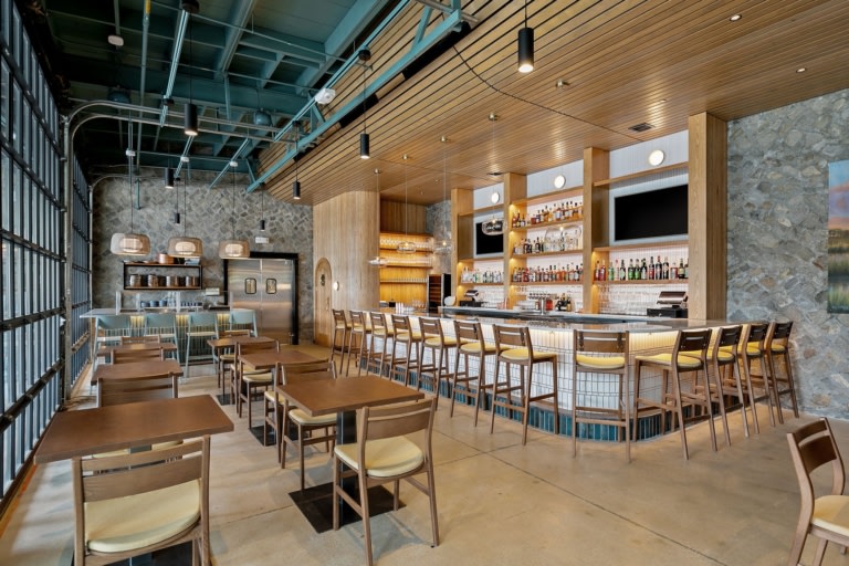 Slack Tide Restaurant View Project 510 Architects Mindie Ballard Sadie II Outdoor by Grand Rapids ChairSigsbee by Grand Rapids Chair Bar, Bar / Counter Seating, Dining Area, dining-table