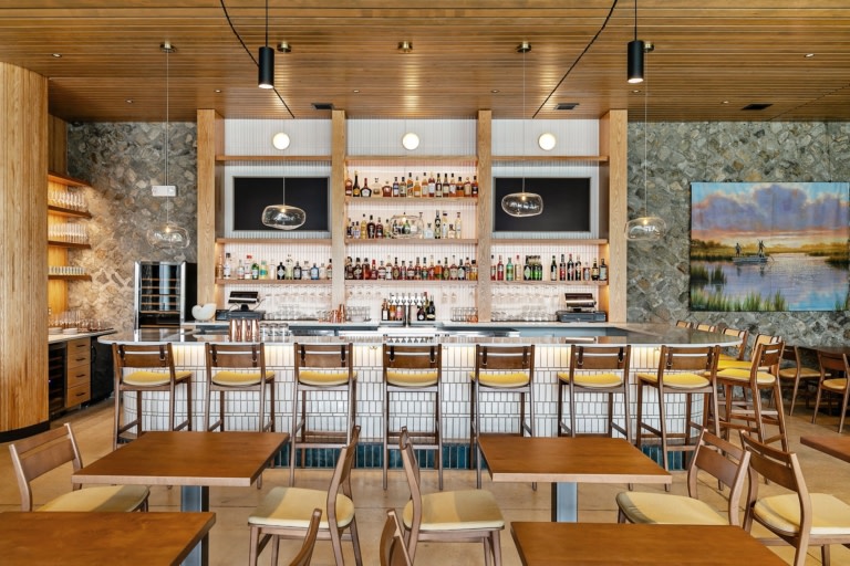 Slack Tide Restaurant View Project 510 Architects Mindie Ballard Sigsbee by Grand Rapids Chair Bar, Bar / Counter Seating, Dining Area, dining-table