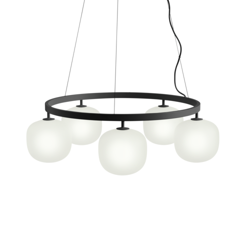 Rime Chandelier reimagines the classic glass pendant as a striking light sculpture. Featuring five mouth-blown, sandblasted glass shades, it casts a soft, refined glow while its square-profile aluminum suspension adds sharp, architectural contrast. Designed for high ceilings, it makes a bold statement above round tables and dining areas. Visible screws and industrial finishes—White, Black, or Aluminium Grey—highlight its modern character. Each shade includes a high-quality G9 bulb with a color rendering index above 90 for warm, consistent illumination. Glass shades, suspension, and cables can all be replaced for lasting durability. The diameter of the shade is 18 cm / 7.09".