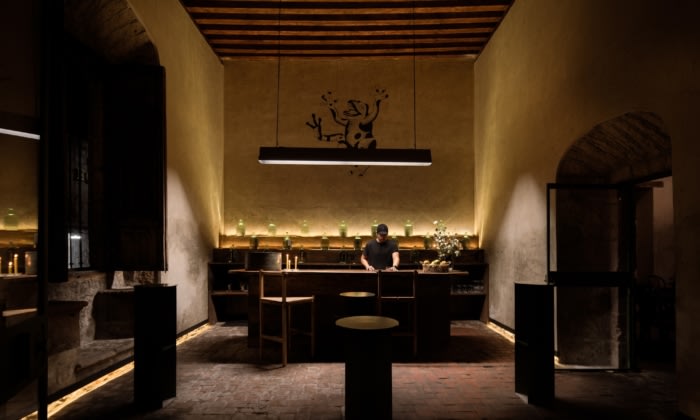 The concept of the bar emphasizes the dishes prepared by the chef, while the indirect light that is on the edge of the floor frames the pre-existing quarry walls, highlighting those layers of history that have been left over time. and rescuing its architectural value.