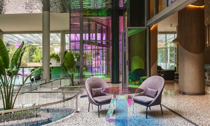Organic, geometrical shapes and colours are placed in the lobby, referencing jewels presented on a minimalistic background of light grey walls. Light is reflected and diffracted through glass walls and elements with dichroic film, which defines the refraction of colour and creates an ever-changing play of light, adding an unexpected artistic feel.