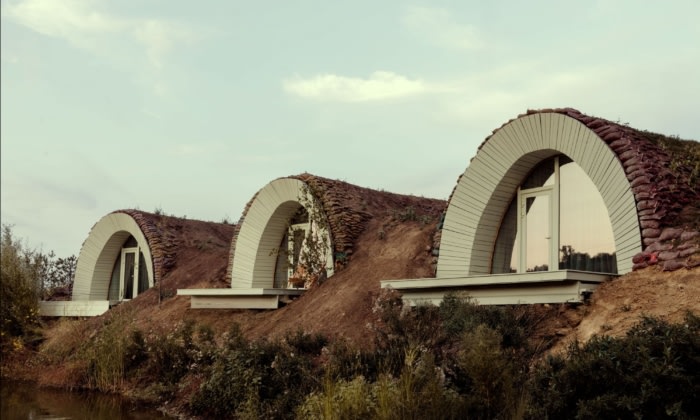 The cabins draw inspiration from the mythic image of hobbit dwellings. Each structure is partly buried in the ground and topped with a green roof, so that the forms read as gentle landforms rather than conventional buildings. This earth-sheltering approach improves thermal stability, reduces energy loss and visually restores the terrain. Domed profiles strengthen the sense of protection, while panoramic glazing opens each cabin towards the water.