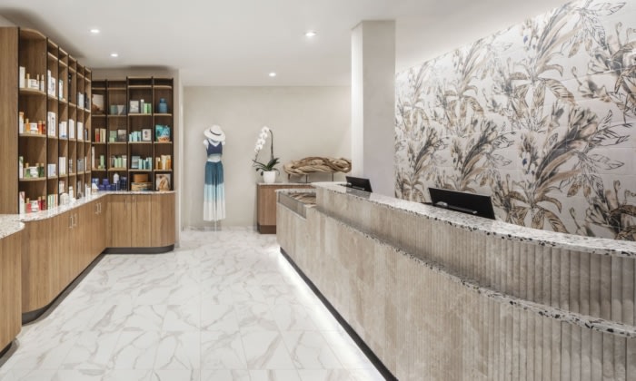 As visitors enter the amenity space, they are enveloped by a light and airy room that infuses one’s senses with reinvigoration. To the left, a reception desk adorned with neutral, fluted tile and terrazzo—made with ocean-inspired flecks of blue and orange—welcomes guests with a sense of luxury. A glass countertop incorporates a custom jewelry display, merging functionality and elegance. The opulent design is further underscored by the marble-pattern flooring and large, tile mural adorned with tropical flora. Next to the desk, //3877 incorporated an employee office to provide staff with easy access and respite. The entire color palette, inspired by the neighboring beach, employs soothing shades of beige with greens and blues to enhance the light, calming environment. The space incorporates soft forms and natural textures within the furnishings and architecture for fluidity throughout.