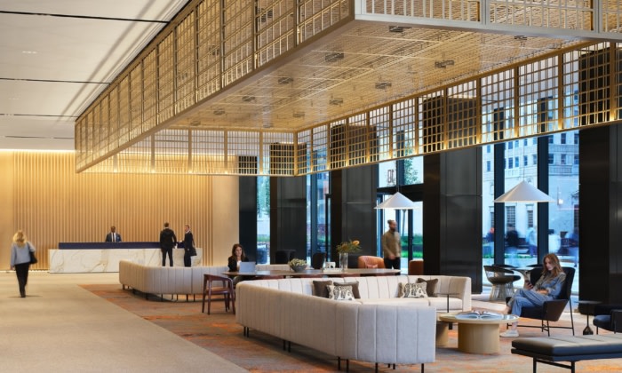 Inside, both buildings now offer a hospitality-driven lobby experience. Decorative canopies and oversized lighting fixtures define “rooms within rooms,” balancing privacy with intuitive wayfinding. The interiors reference the towers’ mid-century origins while incorporating modern finishes that support today’s workplace standards.