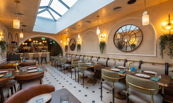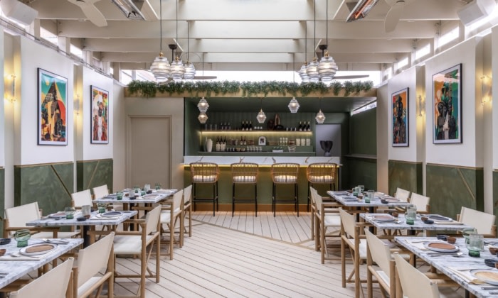 Efes Richmond Plus, designed by Kapeti Interior Architecture in London, harmoniously melds contemporary Mediterranean elegance with British heritage, reimagining a local landmark into a warm, inviting dining destination.