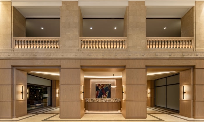 OTJ Architects reimagined the lobby of 222 North LaSalle in Chicago, blending post-modern European design with historical Art Deco elements to create a sophisticated, inviting space for discerning tenants.